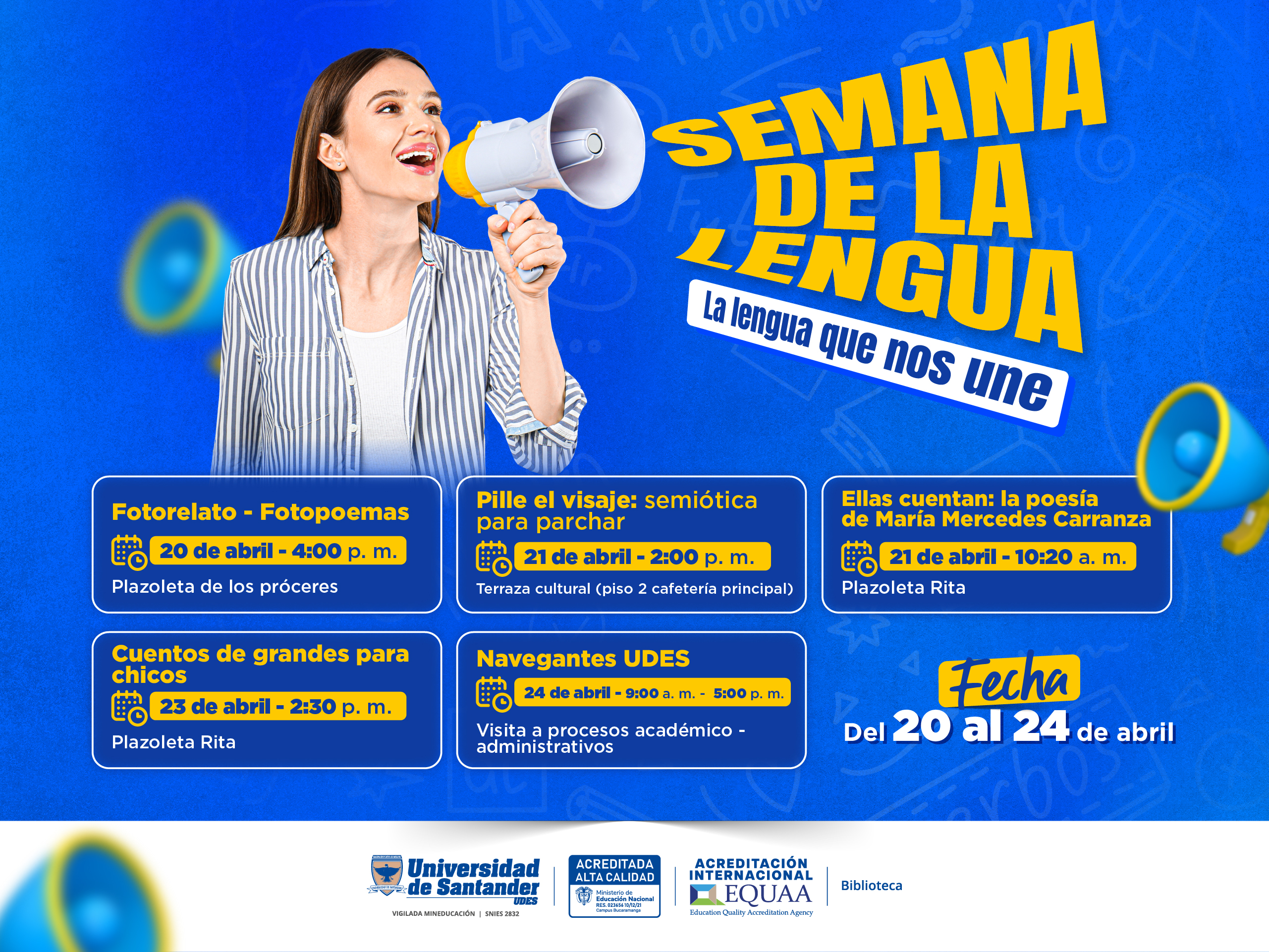 La Biblioteca de la Universidad de Santander (UDES), en el marco de la celebración del Día del idioma español, invita a participar de las actividades de la "Semana de la Lengua: La lengua que nos une", espacios creados para leer, crear y conversar sobre la lengua que nos une.